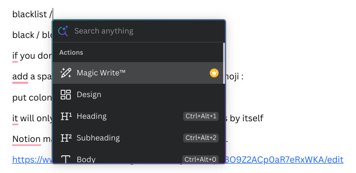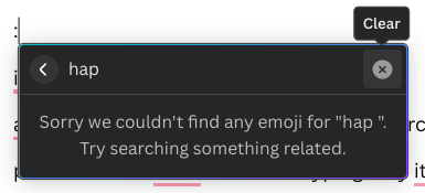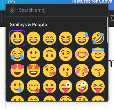 When you type a ":" Canva Docs will open this emoji overlay that is supposed to help you easily insert an emoji.