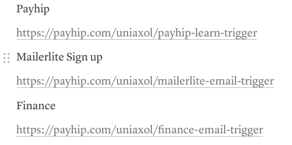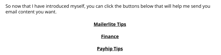 One of my first welcome email is a segmentation email that has links that allow you to choose to be sent finance, Mailerlite, and Payhip tips.