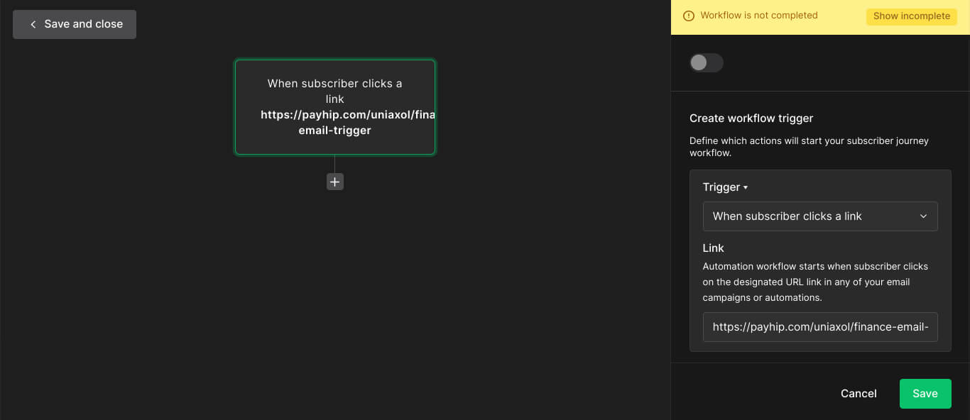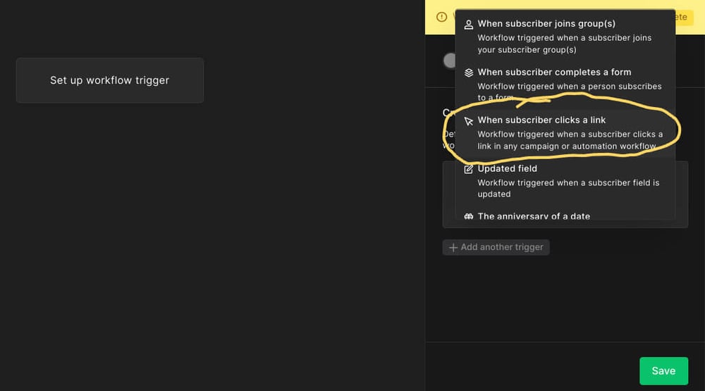 For the trigger (or starting point) set the trigger to “when subscriber clicks a link”.