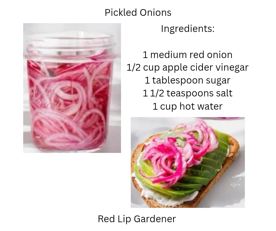 Here's a simple recipe for pickled red onions: Ingredients: 1 medium red onion 1/2 cup apple cider vinegar 1 tablespoon sugar 1 1/2 teaspoons salt 1 cup hot water Steps: Thinly slice the red onion. In a jar, combine apple cider vinegar, sugar, salt,...