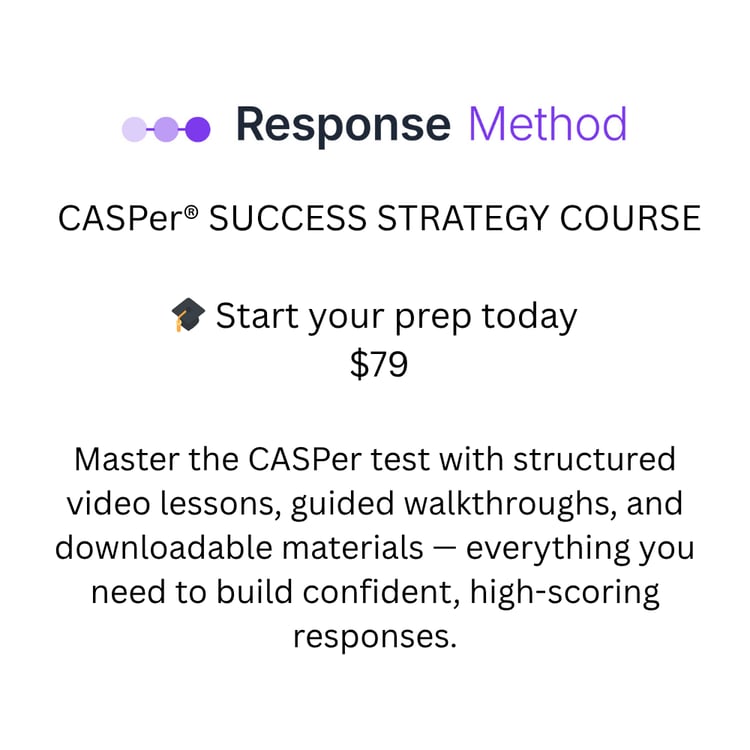 The CASPer Success Strategy Course gives you complete preparation with my exclusive framework, practice timed scenarios, and skill-building across all nine competencies.
