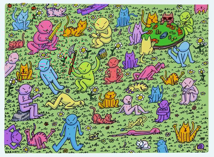 Soy artista visual y trabajo principalmente con ilustración y dibujo. Mi arte está lleno de animales, humor y cosas monas, sobre todo gatitos, ranas y personajes raros con mucha personalidad. Además de ilustraciones y pegatinas, hago pendientes, llaveros, imanes y chapas, todo esculpido, pintado y dibujado a mano. Tengo experiencia moviendo y vendiendo mi trabajo en mercadillos y eventos culturales, gestionando todo el proceso de forma independiente. Si te gustan las cosas raras, monas y hechas con cariño, probablemente aquí encuentres algo para ti.