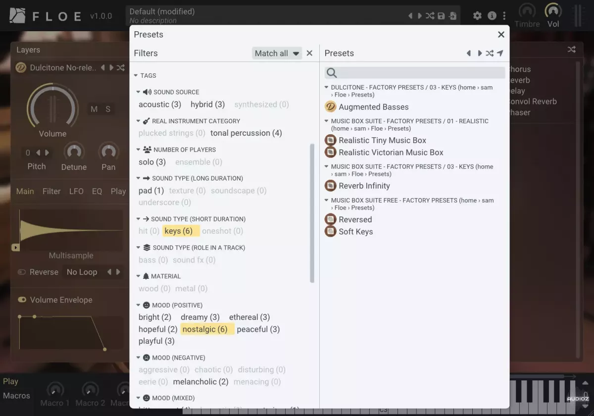 Floe’s intuitive browsing system works across all your Floe sample libraries, bringing together instruments and presets through extensive categories, standardised tags (by mood, timbre, type, etc.), and search. The sound you need is always a few clicks away.