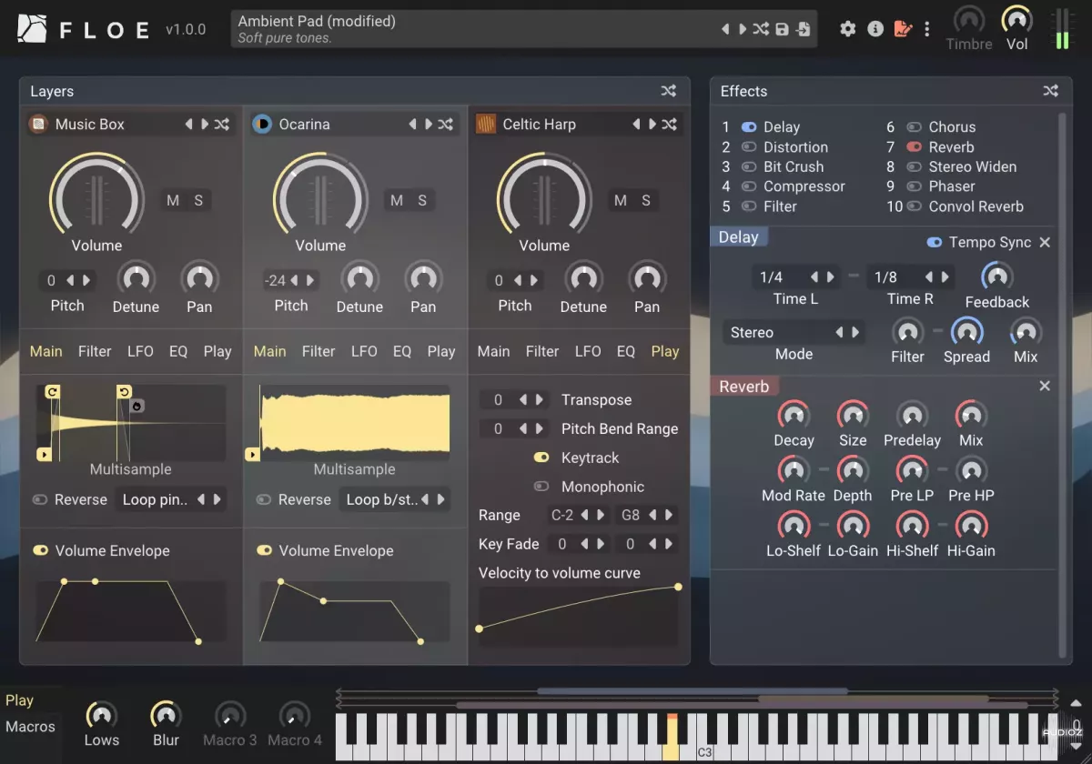 With three distinct layers, Floe lets you blend instruments across different libraries. Transform sounds with loop and crossfade controls that bridge the gap between multisampling and synthesis. Process the sounds further with a rack of 10 built-in effects.