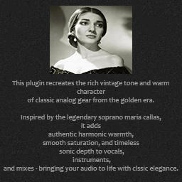 This plugin recreates the rich vintage tone and warm character of classic analog gear from the golden era. Inspired by the legendary soprano Maria Callas, it adds authentic harmonic warmth, smooth saturation, and timeless sonic depth to vocals, instruments, and mixes — bringing your audio to life with classic elegance.