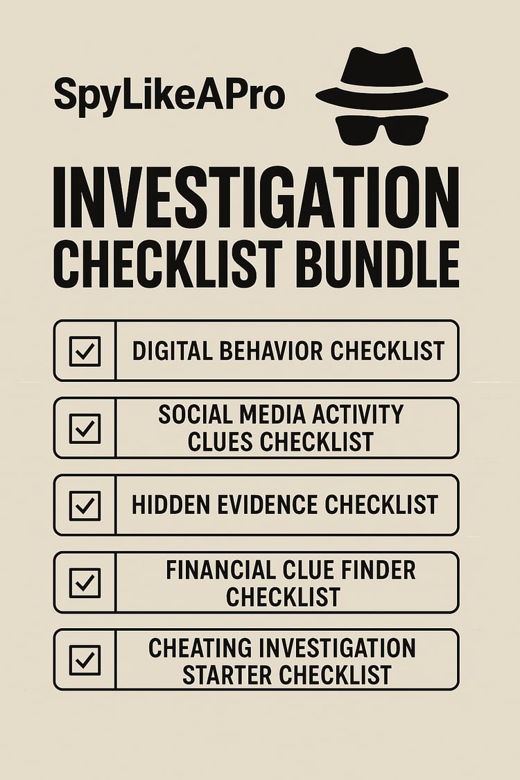 SpyLikeAPro is a digital resource hub for discreet, real-world investigation tools. Our checklists and guides are designed to help you identify signs of cheating, track suspicious behavior, and document potential evidence—without hiring a professional. Built by experienced investigators, our products give you clear steps, smart strategies, and the confidence to uncover the truth on your own terms.