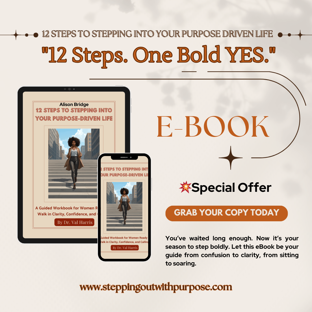 Dr. Val is an author, Life Purpose Coach, Leadership Consultant, entrepreneur, and founder of The Stepping Out with Purpose, LLC. Through her company, she provides online courses, professional development, and consulting services to help aspiring leaders and entrepreneurs gain the confidence and tools to make their life dreams and business a reality.