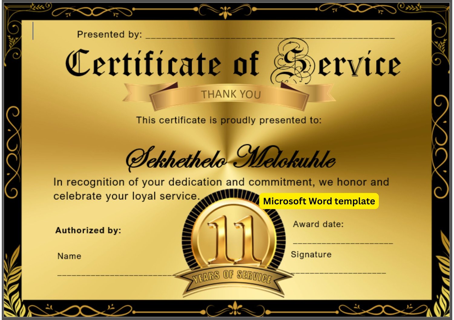 11 Years of Service - Editable Microsoft Word template with logo tailored with number of years G202L110056