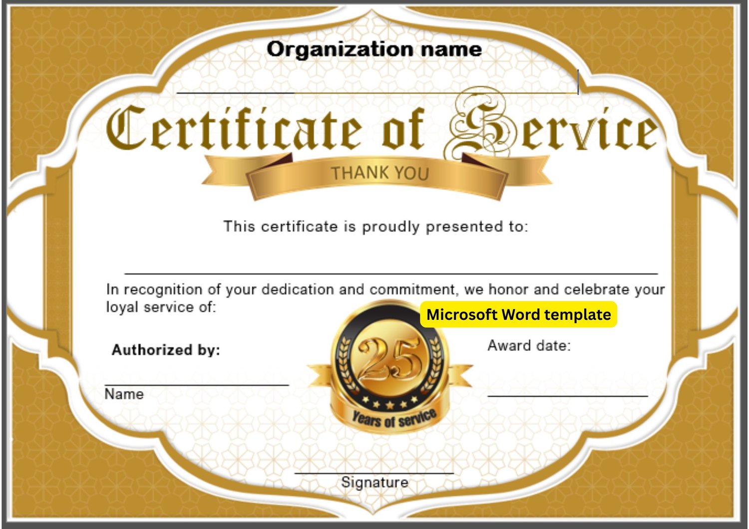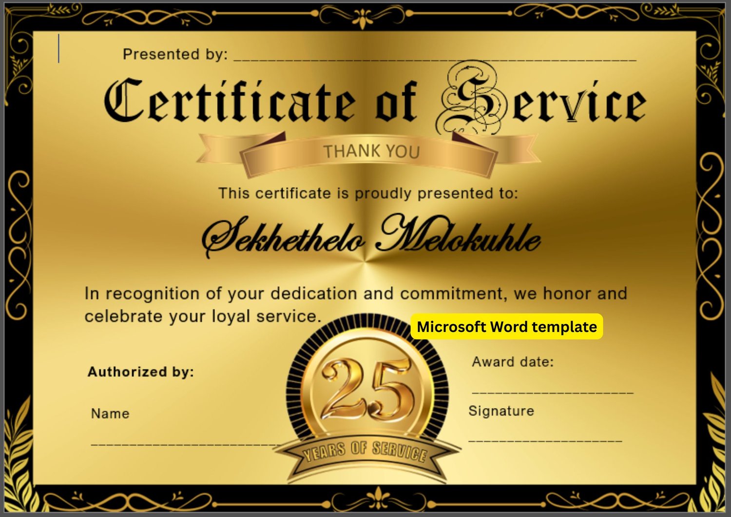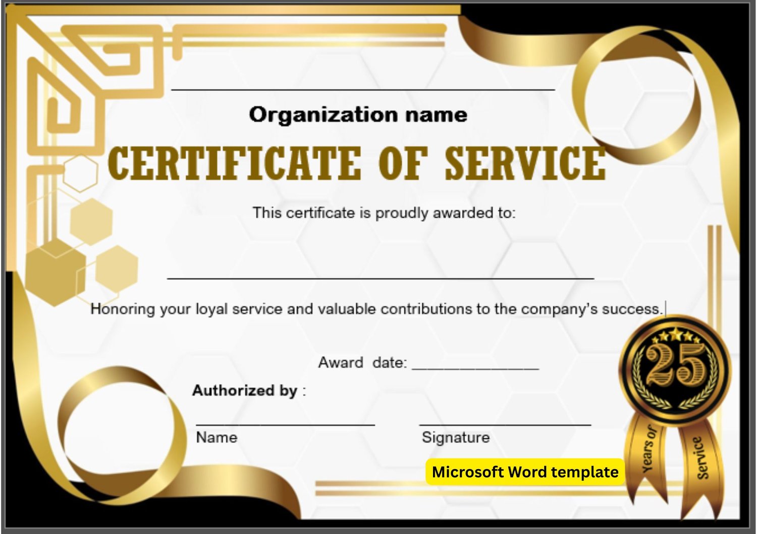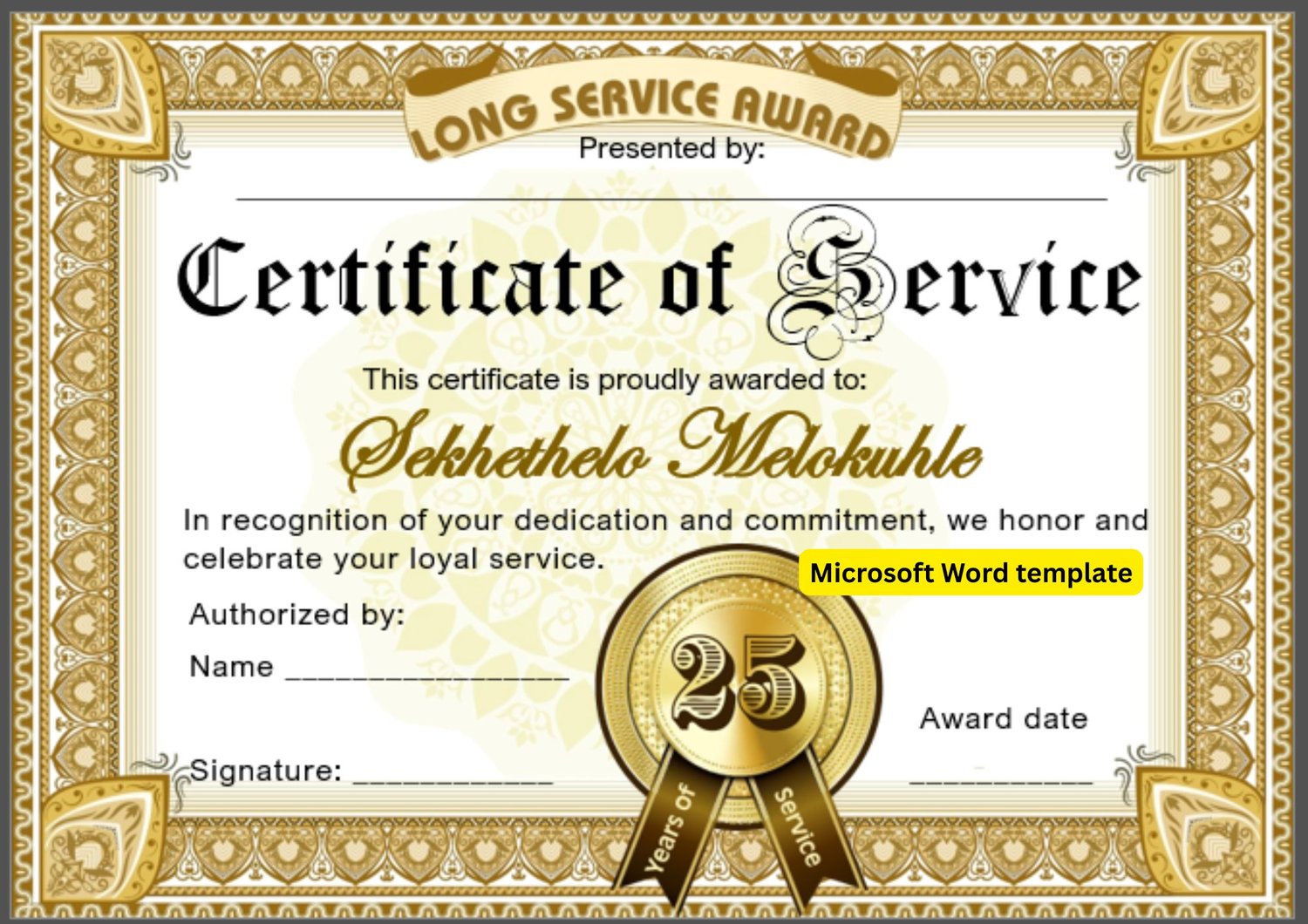 25 Years of Service - Editable Microsoft Word template with logo tailored with number of years G202L250070