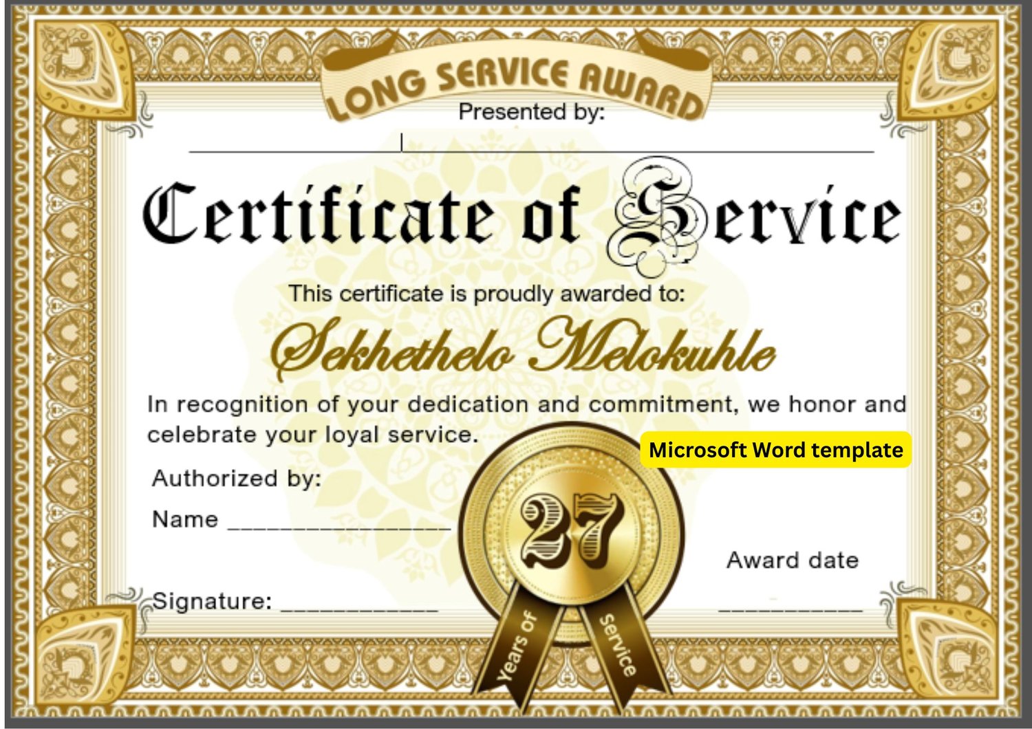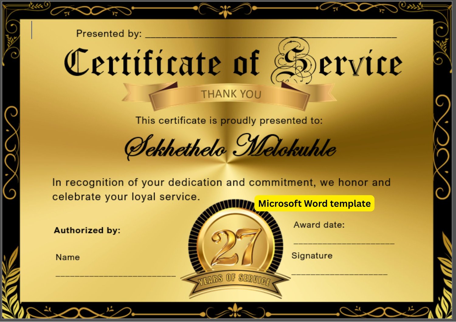27 years of service | Editable Microsoft word certificate template | Landscape G11