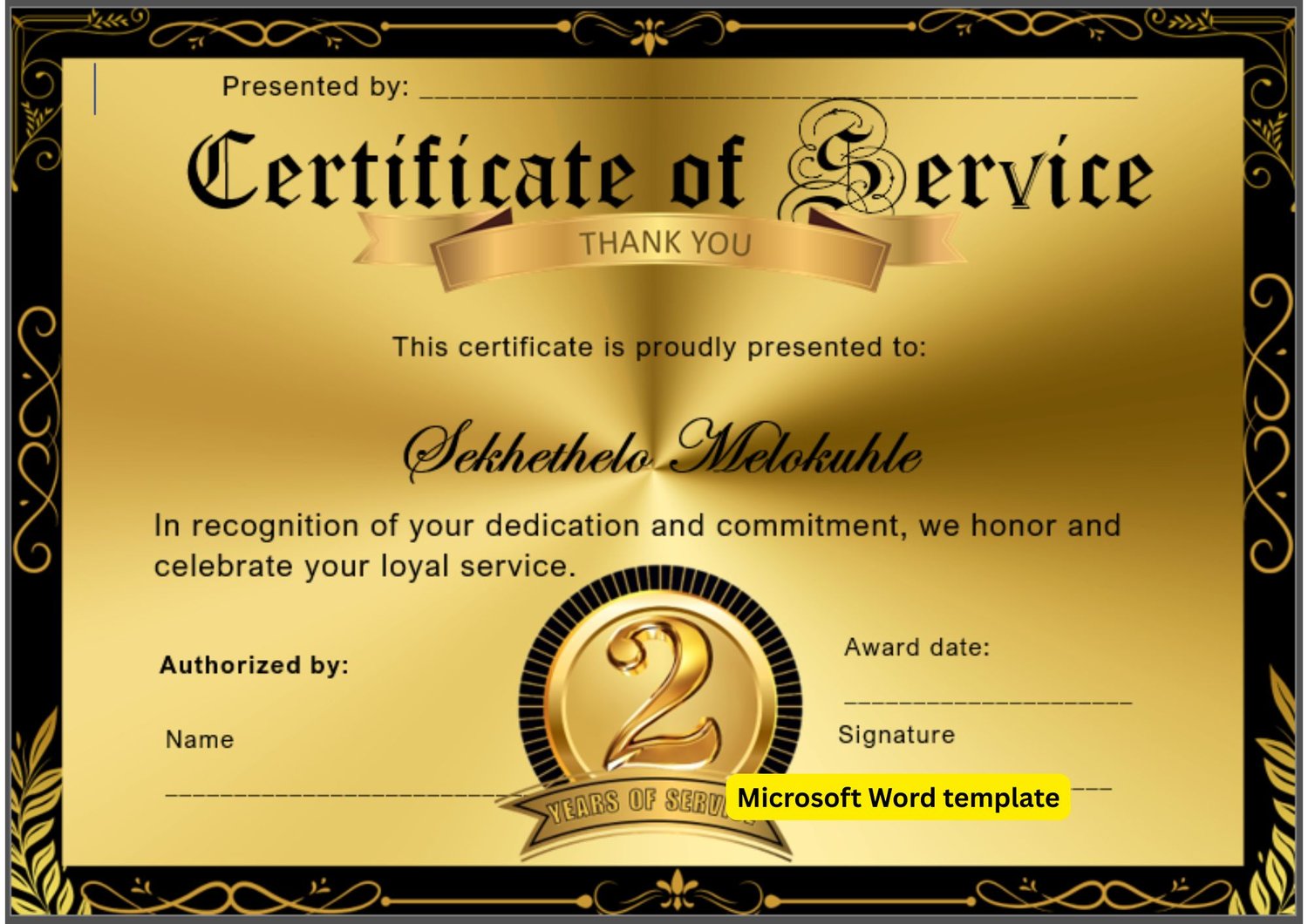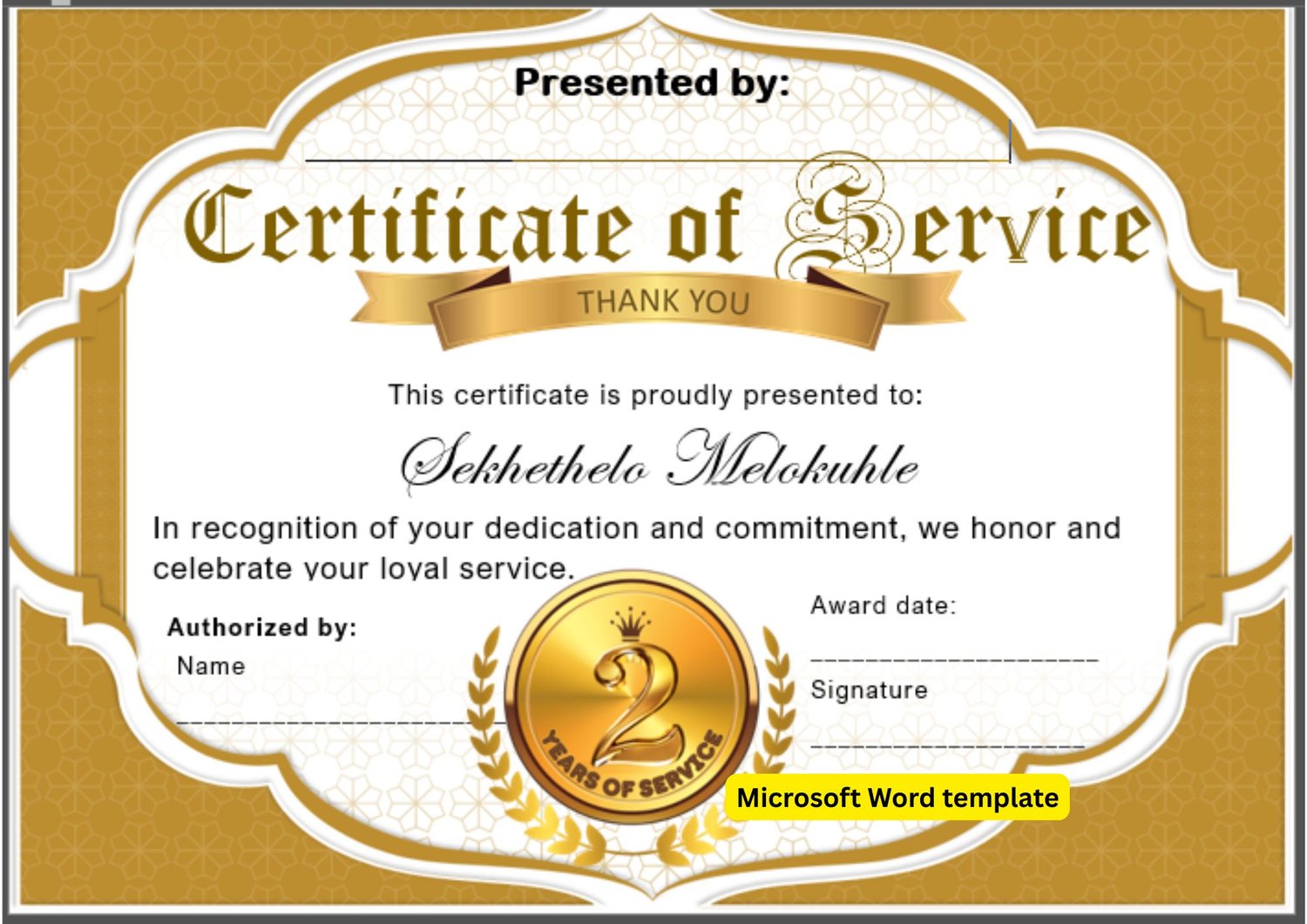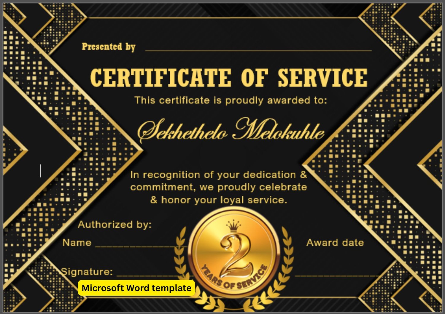 2 years of service | Editable Microsoft word certificate template | Landscape G11