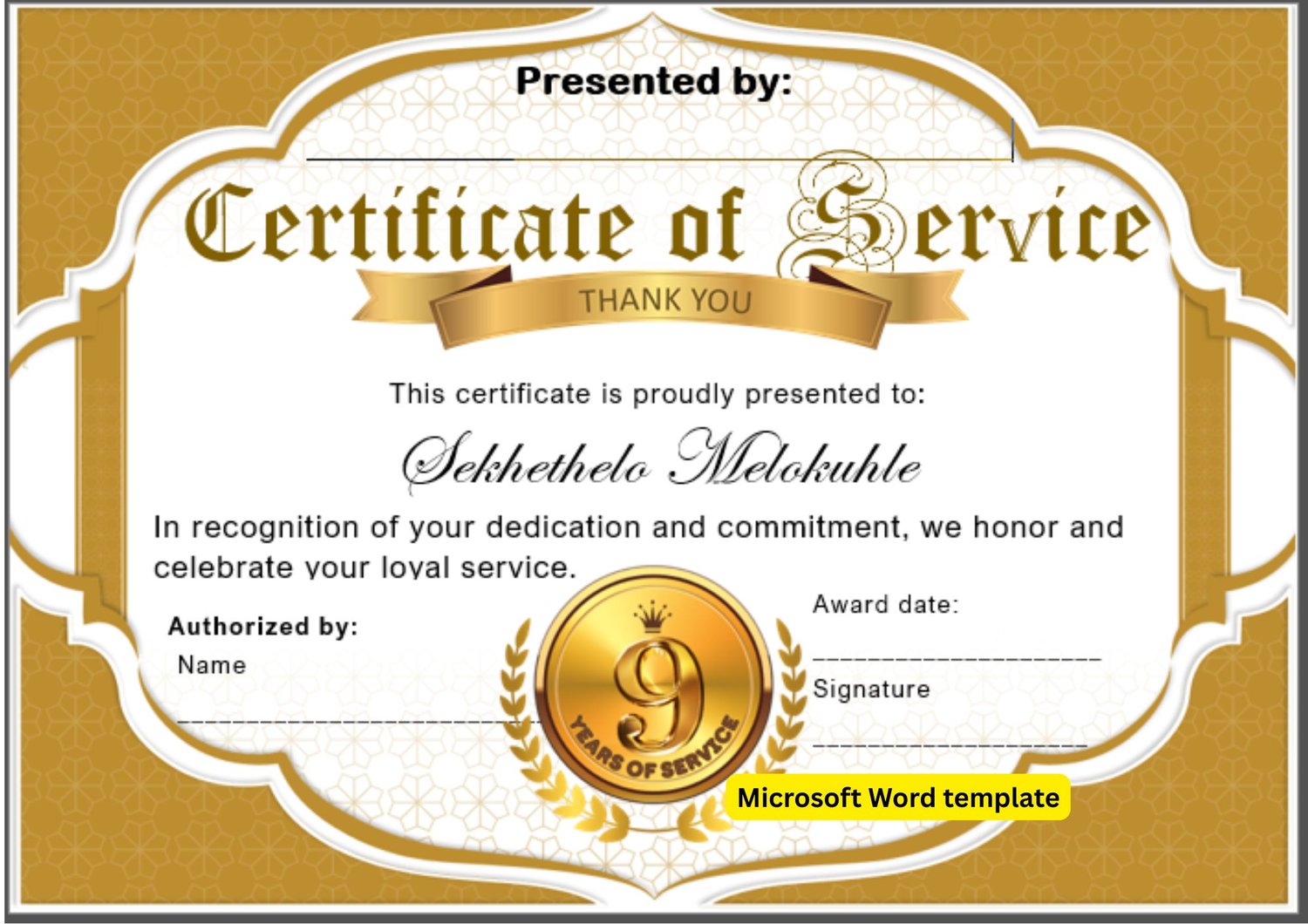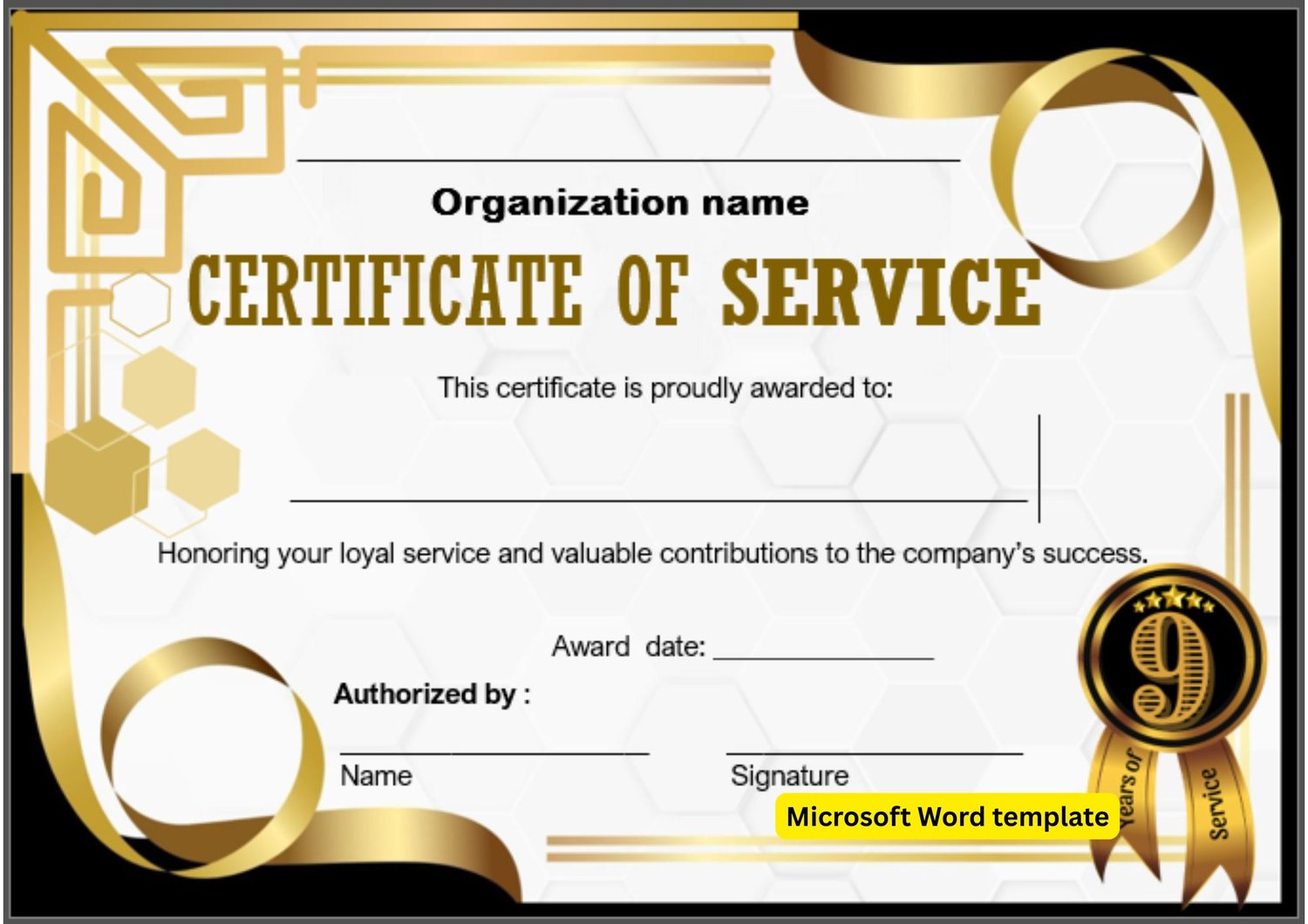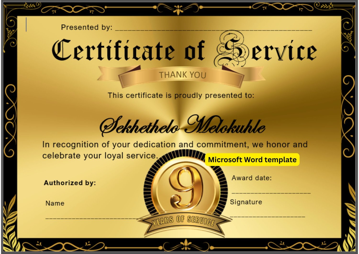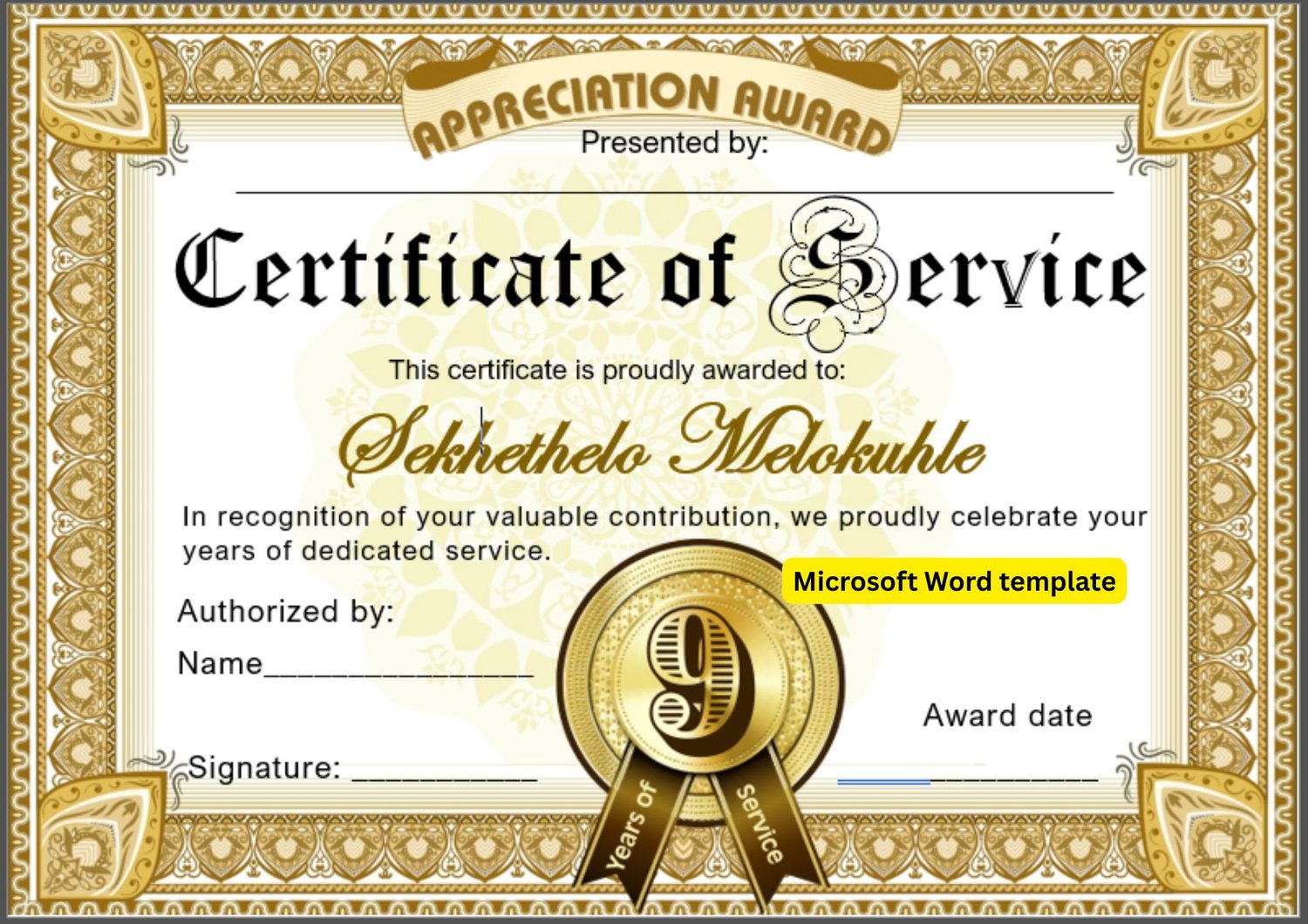 9 years of service | Editable Microsoft word certificate template | Landscape G11