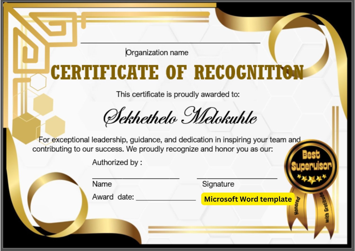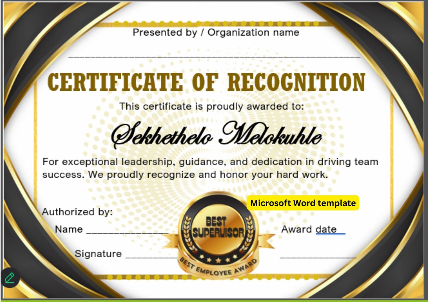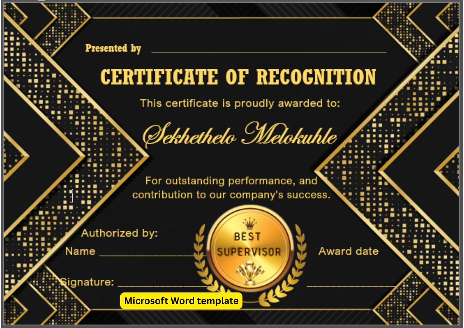 Best Supervisor Certificate Template (Editable Word File) Black & Gold