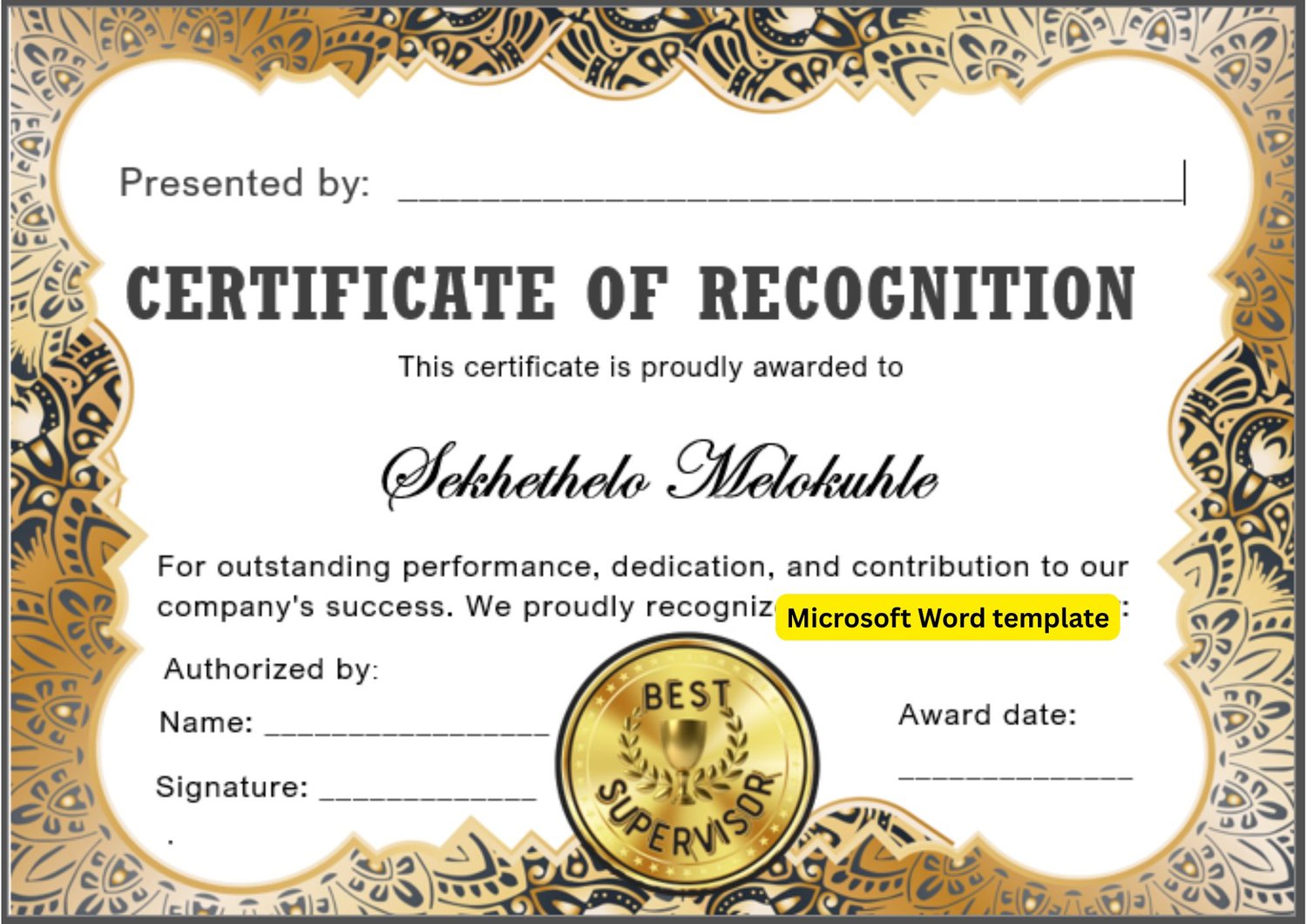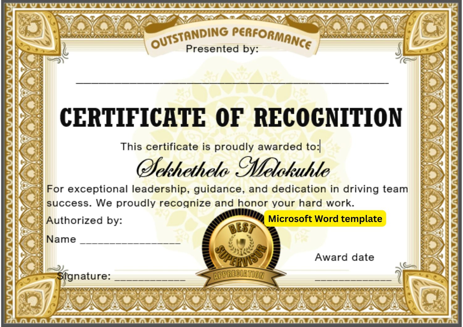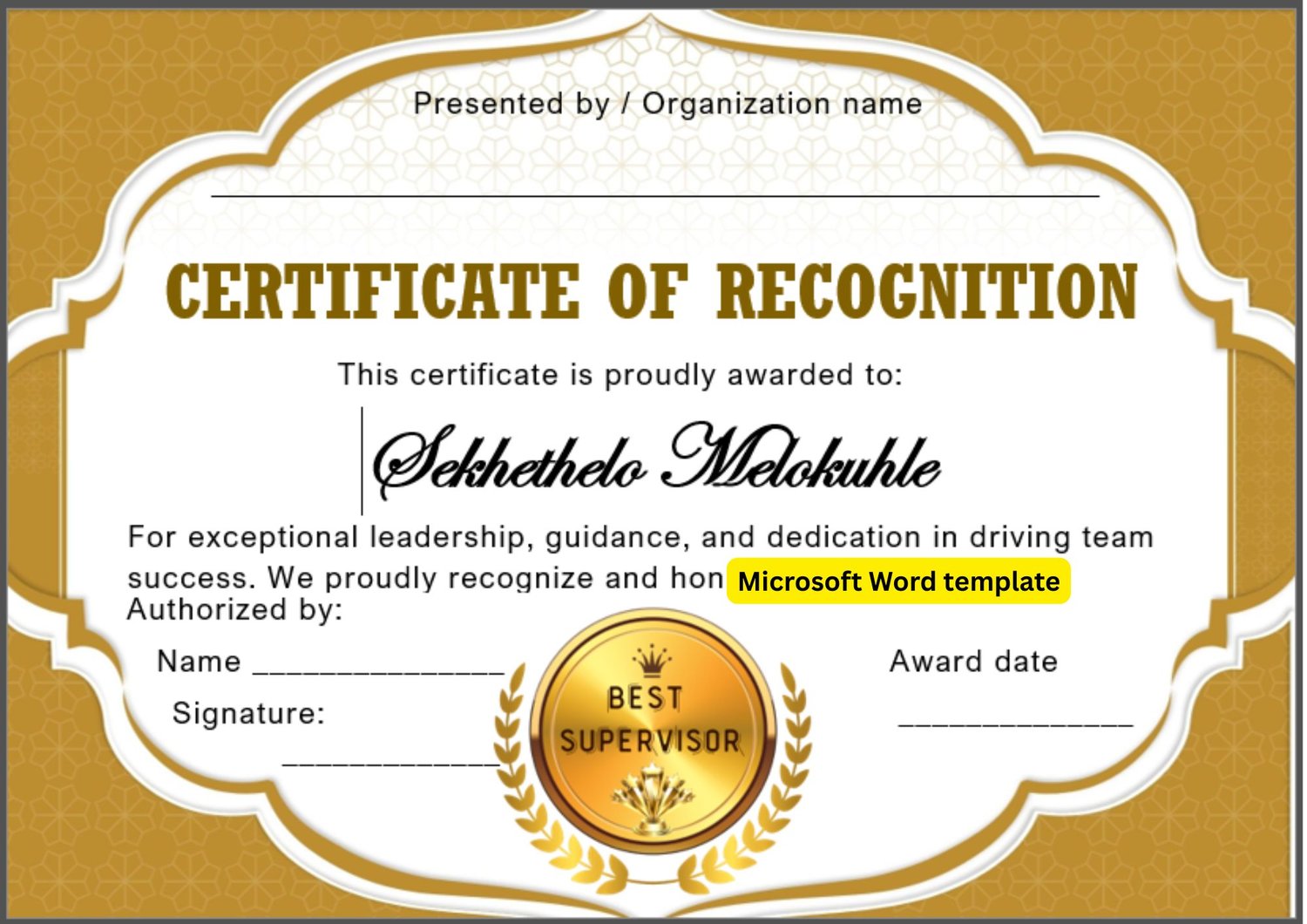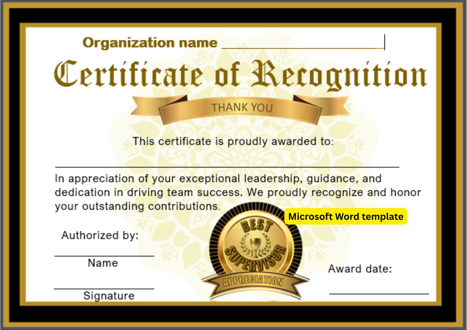 Best Supervisor Certificate Template (Editable Word File) Black & Gold