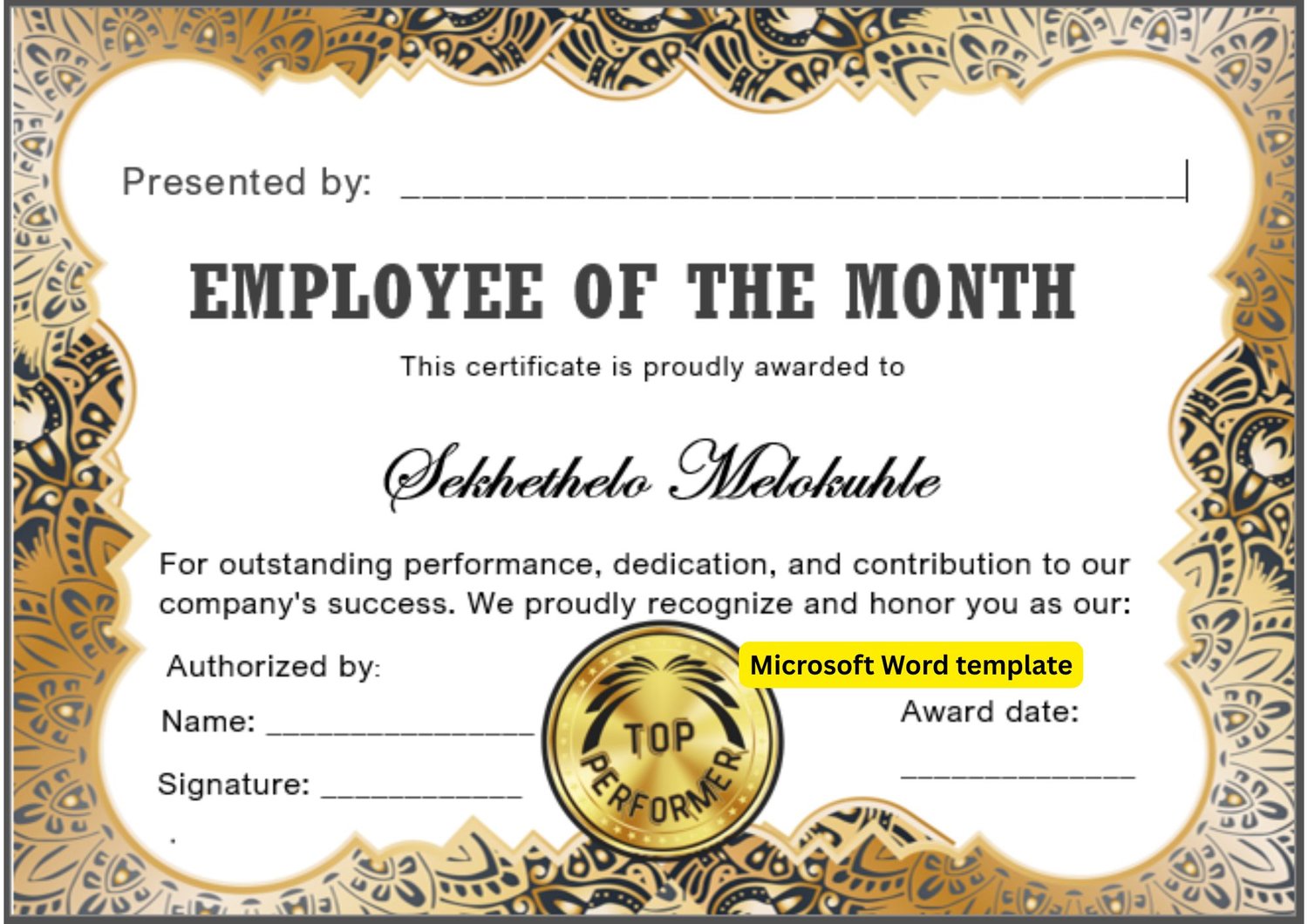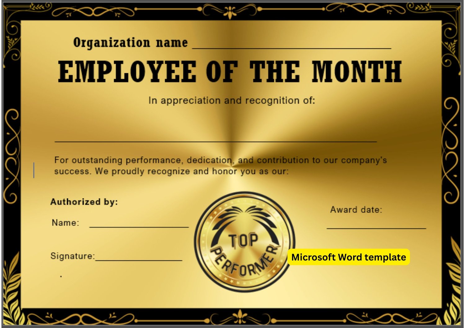 Employee of the month | Top performer | Microsoft word Certificate template Landscape