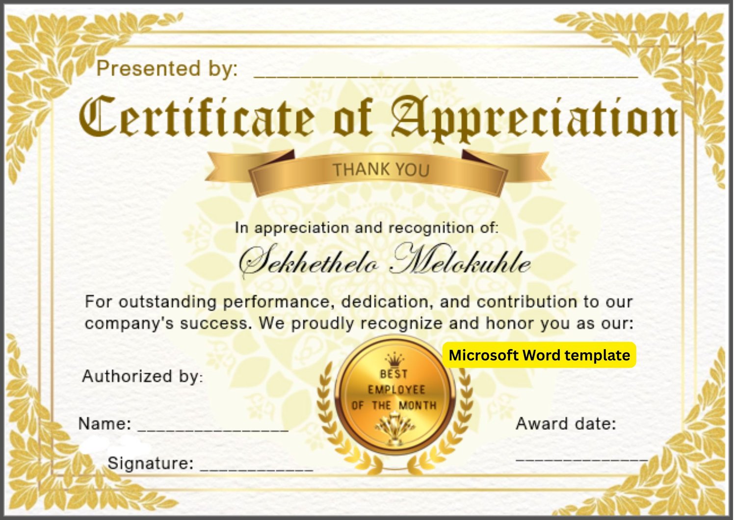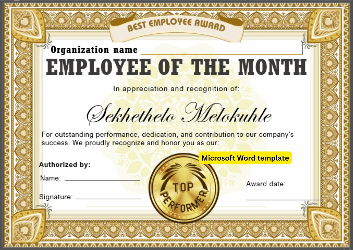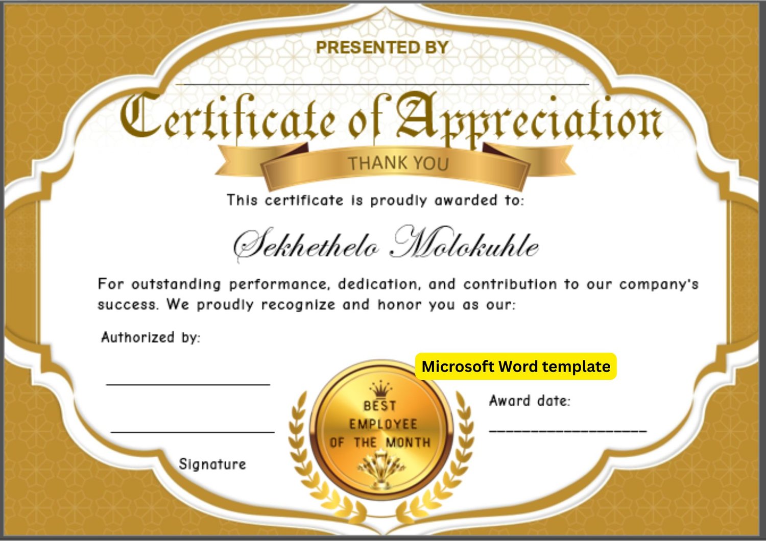 Employee of the month | Certificate of Appreciation | Editable Microsoft word templatate | Landscape