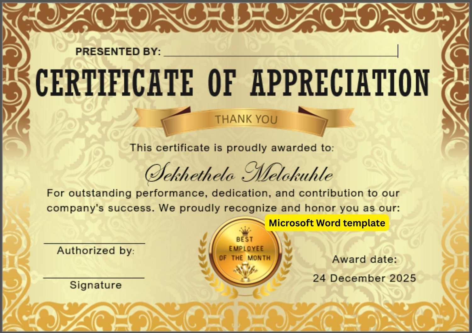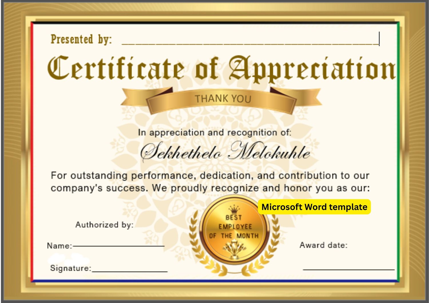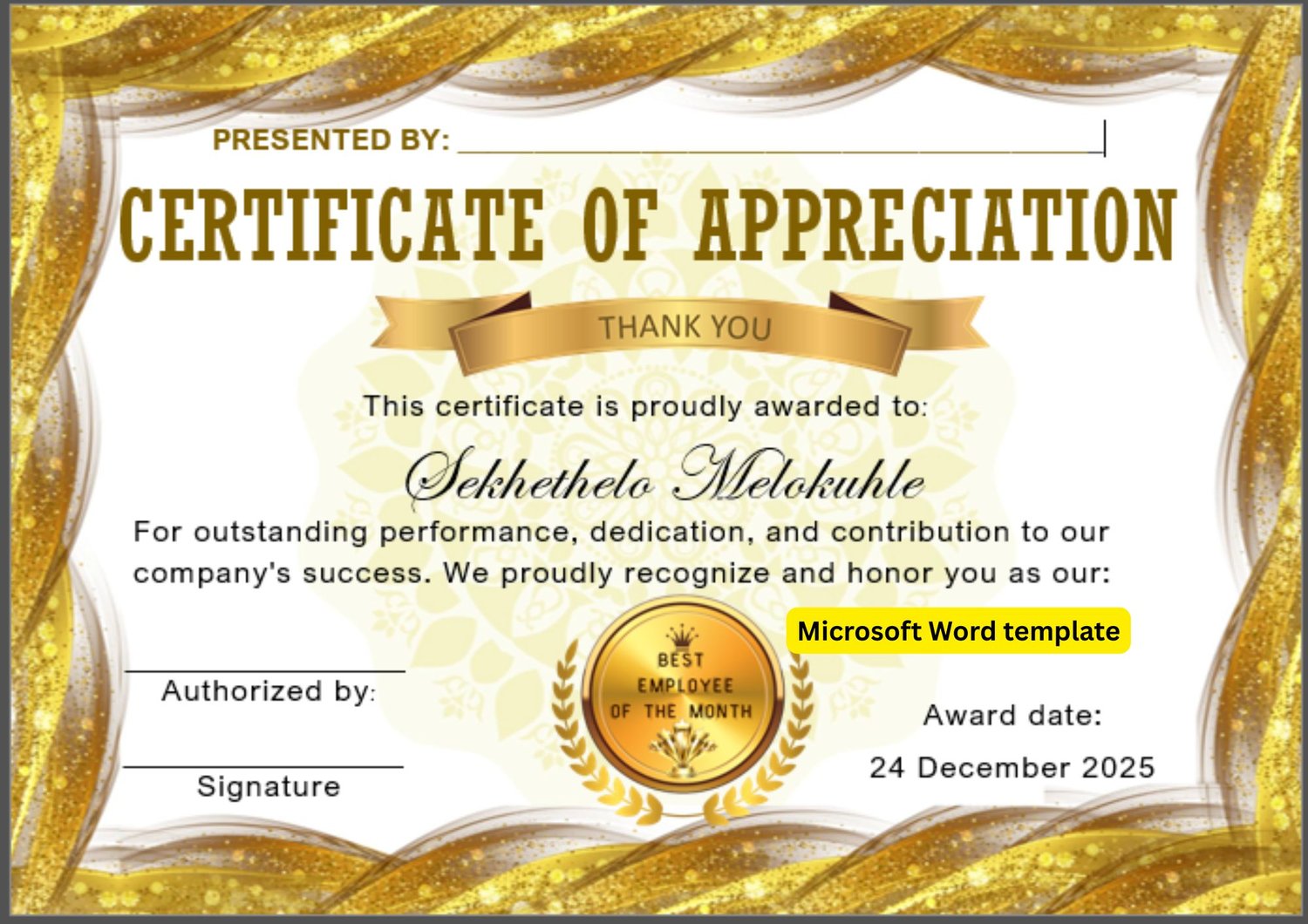 Employee of the month | Certificate of Appreciation | Editable Microsoft word templatate | Landscape