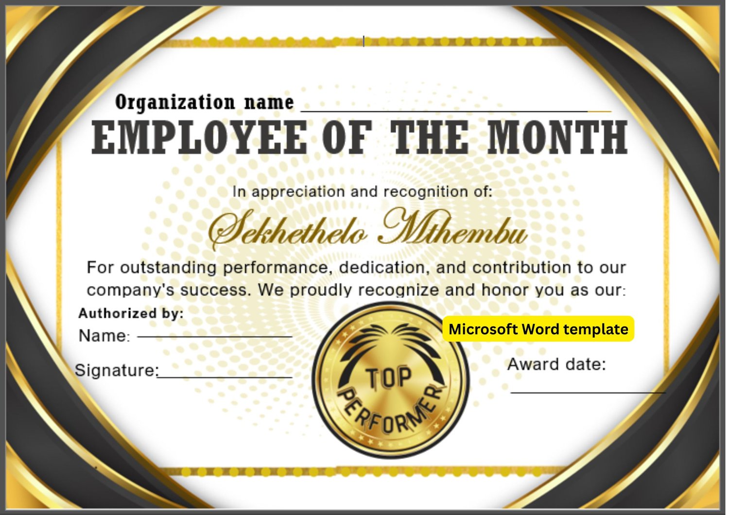 Employee of the month | Certificate of Appreciation | Editable Microsoft word template | Landscape