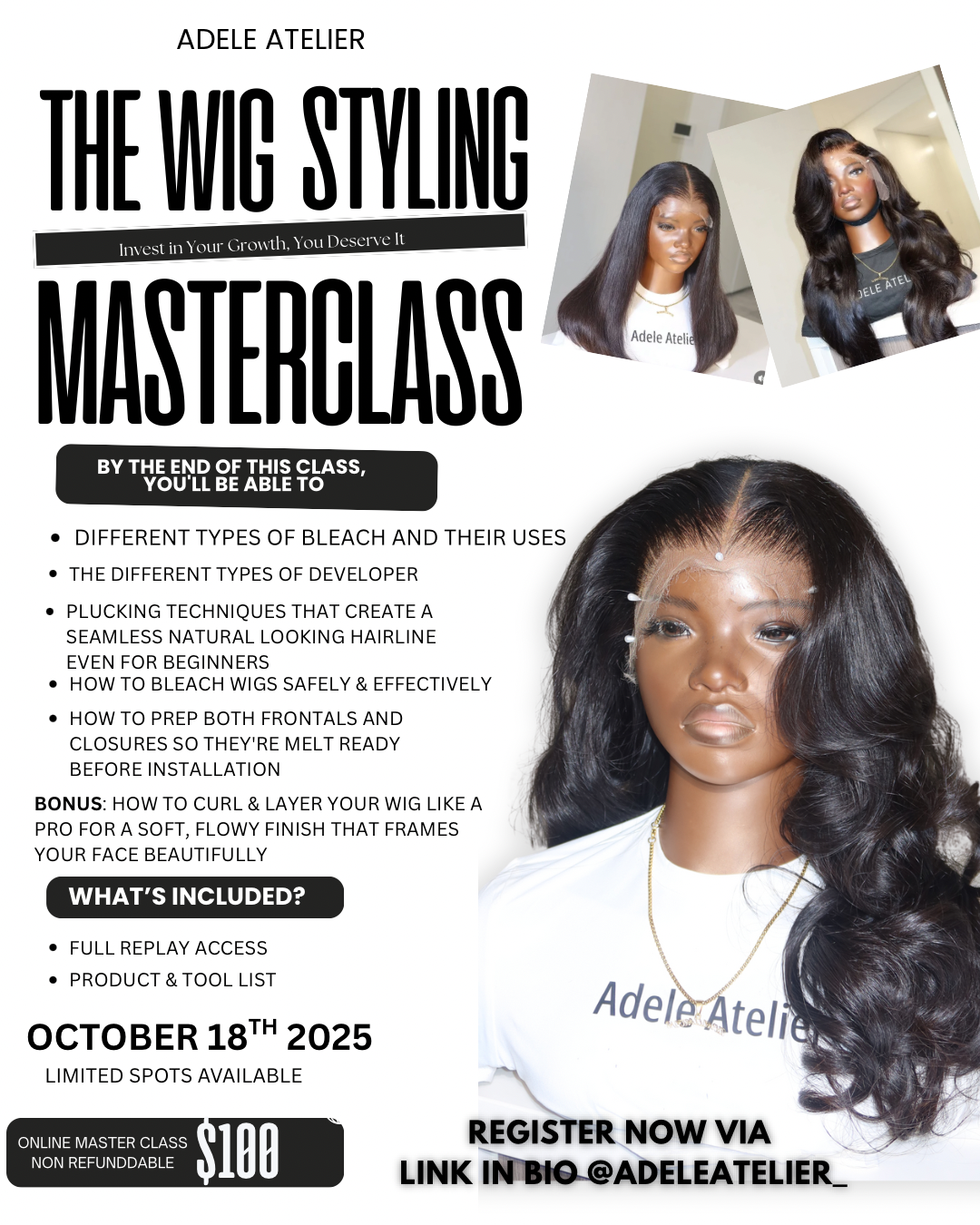 Hi, I’m Matilda the founder of Adele Atelier and the heart behind every wig I create. My journey started by handcrafting wigs for a loved one battling cancer, and it grew into a passion for helping women everywhere feel confident and beautiful. Today, I teach, style, and design high quality wigs and extensions that empower people to embrace their beauty on their own terms. Whether through masterclasses, custom creations, or community, my goal is to share knowledge, inspire confidence, and make flawless hair accessible to everyone.