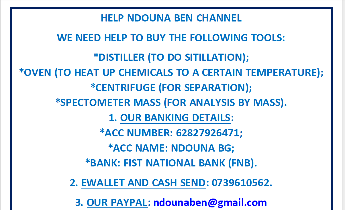 I'm Ndouna Ben, Founder and CEO of Mak products. I offer services related to industrial chemistry, we sell eBooks on how to manufacture chemicals, and we also offer trainings on Manufacturing of detergents, cleaning products, lubricants and many other industrial products. you can check out my Youtube channel, the channel name is Ndouna Ben.