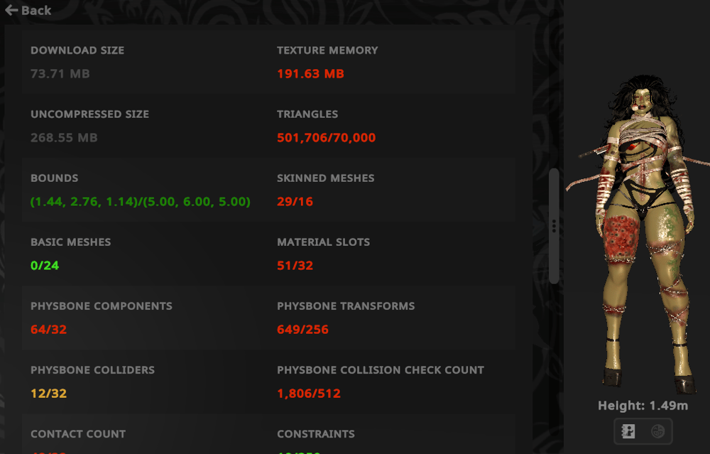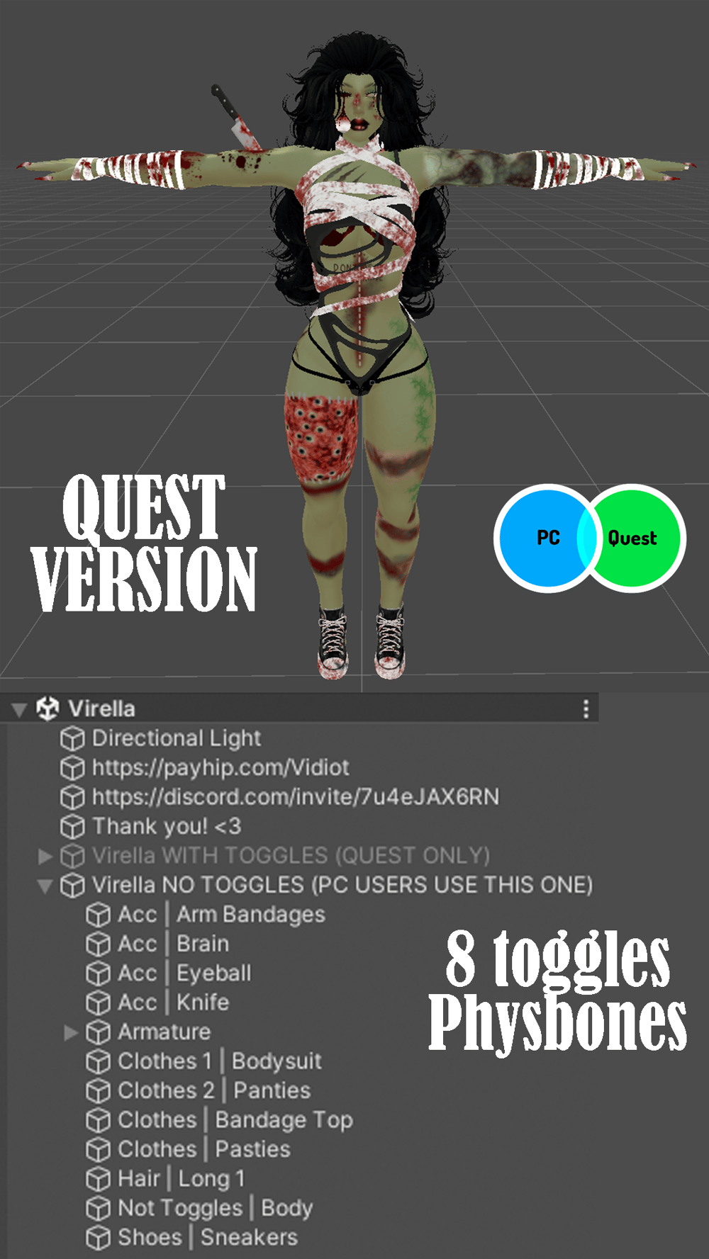Head ☠︎︎ Body ☠︎︎ Arm bandages ☠︎︎ Barb Wire + Leg Chains ☠︎︎ Brain ☠︎︎ Broken bones ☠︎︎ Earrings ☠︎︎ Eyeball ☠︎︎ Nails ☠︎︎ Knife ☠︎︎ Bodysuit ☠︎︎ Jorts ☠︎︎ Bandage Top, Dangle Bandages ☠︎︎ Dress, Bra, Panties, Belt, Leg Bandages ☠︎︎ Pasties ☠︎︎ Braids ☠︎︎ Long 1 ☠︎︎ Long 2 ☠︎︎ Ponytail ☠︎︎ Short ☠︎︎ Heels ☠︎︎ Sneakers ☠︎︎ Beating Heart ☠︎︎ SPS ☠︎︎