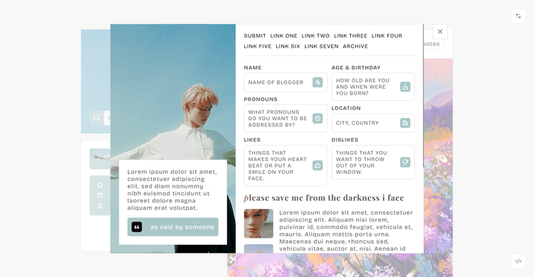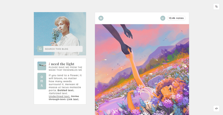 Welcome to my store. 💖 Here you will find a plethora of minimalistic Tumblr themes for either personal, roleplay or fansite-directory blogs. These themes are designed and coded by an overly caffeinated trash panda, me. All are made with love and meticulousness.