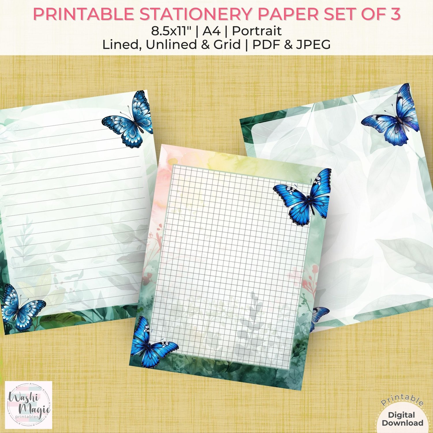 Butterfly Themed Birthday Stationery Set Printable Lined, Blank, Grid Paper, Birthday Paper for Her