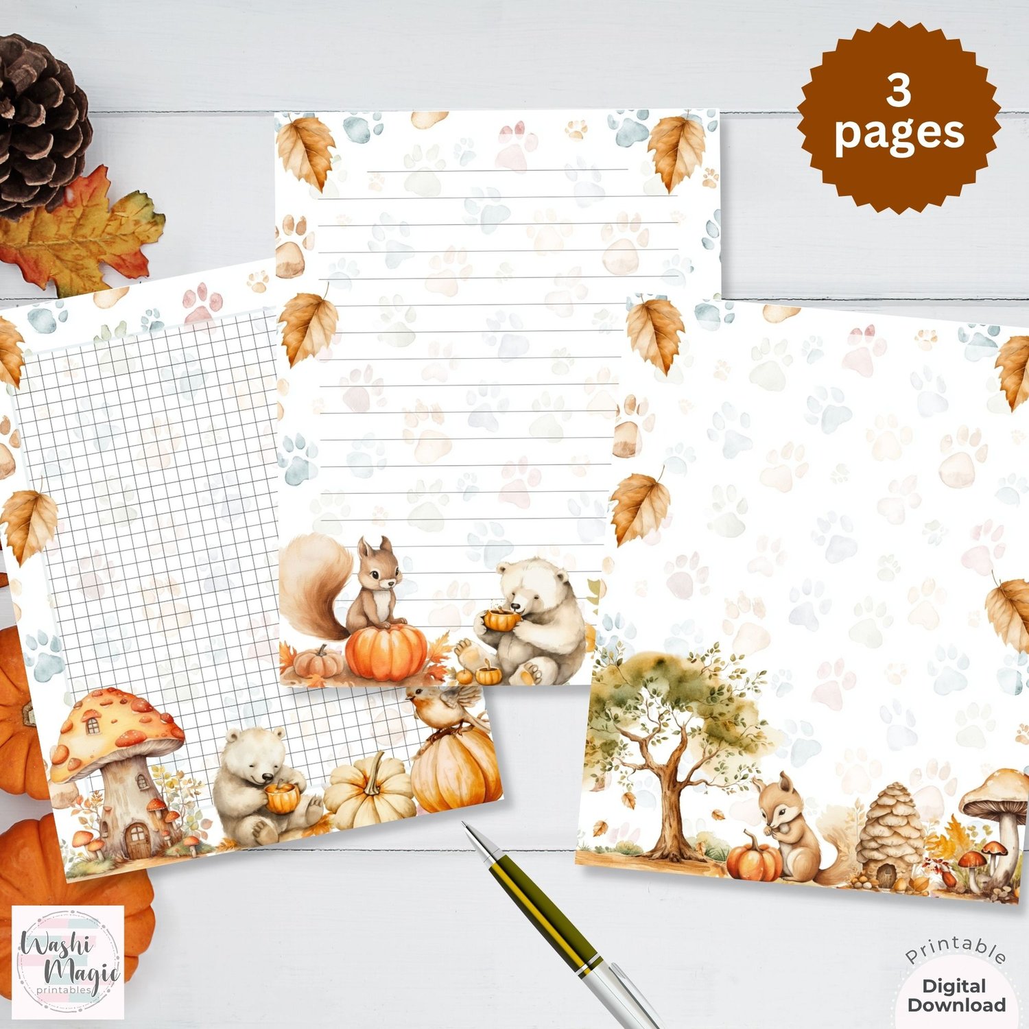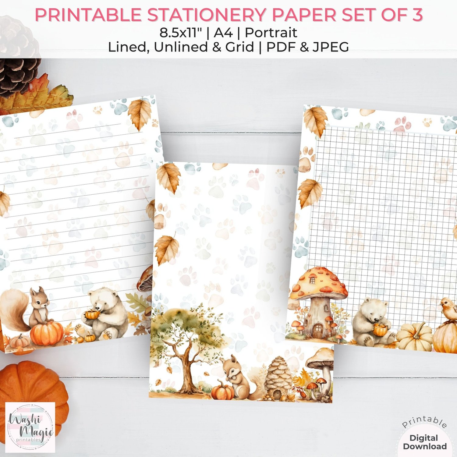 Fall-Themed Cute Woodland Animals Stationery Set: Lined, Unlined, Grid Paper Collection